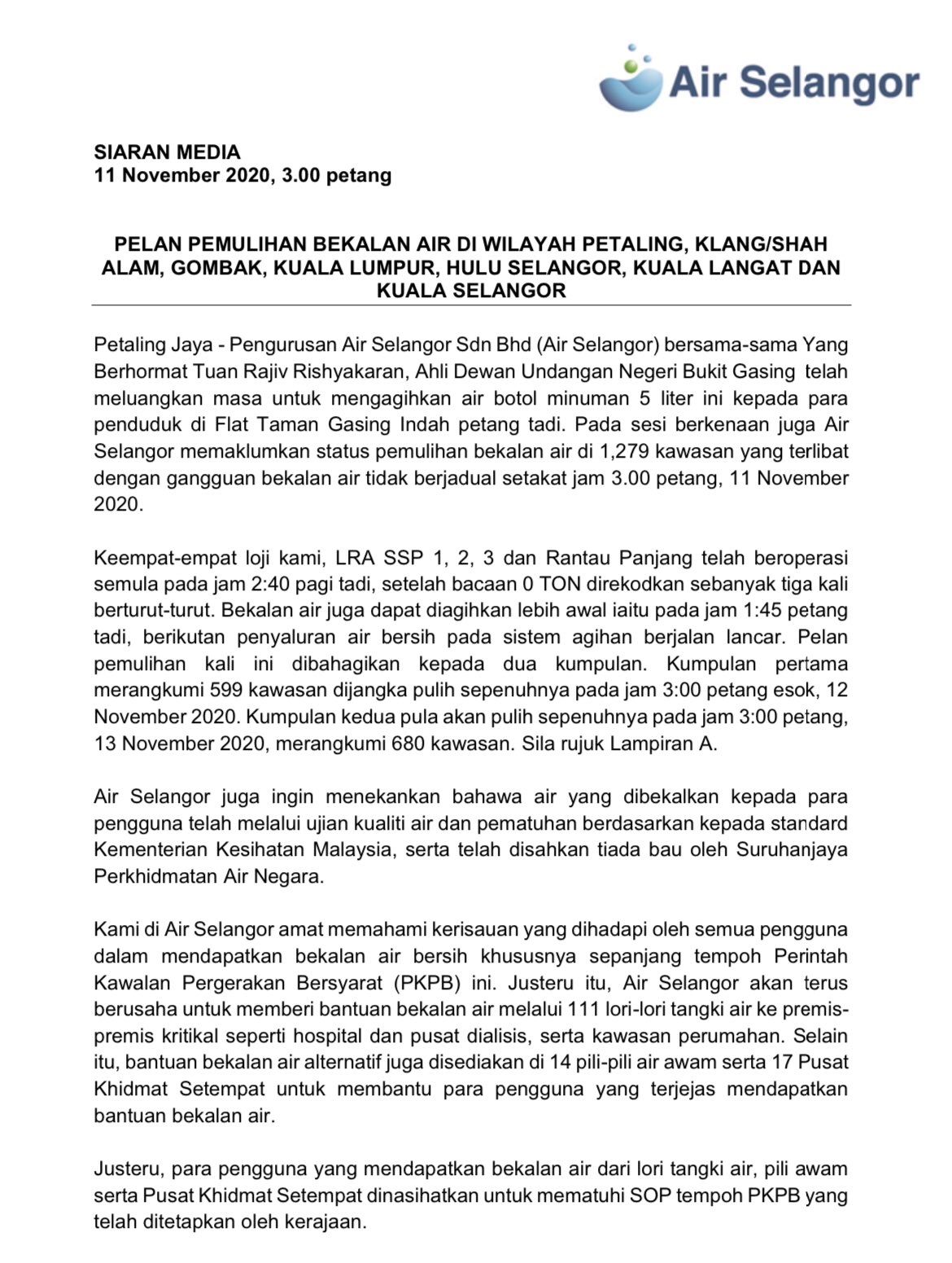 Air Selangor Siaran Media Pelan Pemulihan Bekalan Air Di Wilayah Petaling Klang Shah Alam Gombak Kuala Lumpur Hulu Selangor Kuala Langat Dan Kuala Selangor Senarai Penuh Pelan Pemulihan Boleh Didapati Di